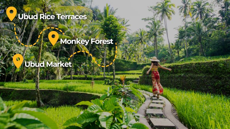 Explore Bali’s best! Wander Tegalalang Rice Terraces, meet monkeys in the Sacred Forest, and shop Ubud’s vibrant markets for handcrafted souvenirs and local treats.