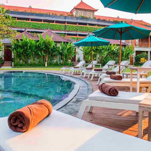Spending your holiday here, you’ll have the perfect base for exploring Bali’s wonders. Lounge by their sparkling swimming pool or take a short walk to the nearby Legian Beach, where you can soak up the sun and enjoy the refreshing ocean waves. Immerse yourself in the cultural and natural treasures of Bali, or venture out to experience the vibrant nightlife that awaits you just around the corner.