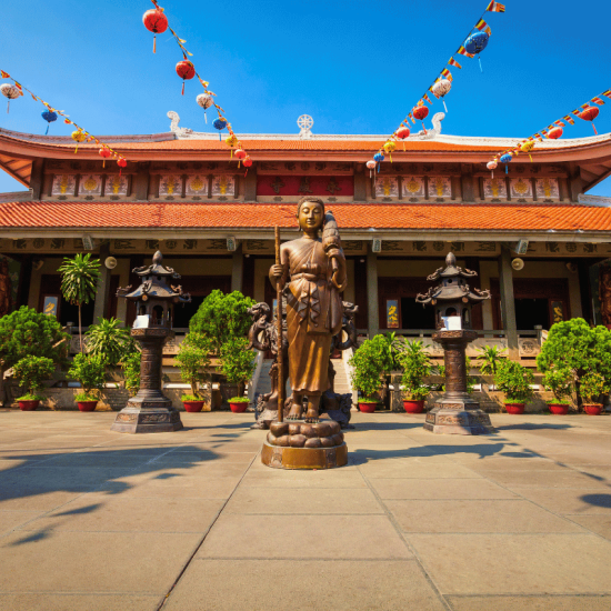 Mekong Delta Experience: Embark on a scenic motor-boat cruise along the Mekong River, witnessing the Dragon, Unicorn, Turtle, and Phoenix islands. Experience local culture at a traditional workshop making coconut candy, visit a local family for music and conversation, row a sampan, enjoy a Vietnamese 5-course meal, and explore the historic Vĩnh Tràng pagoda, adorned with ancient Buddha statues.