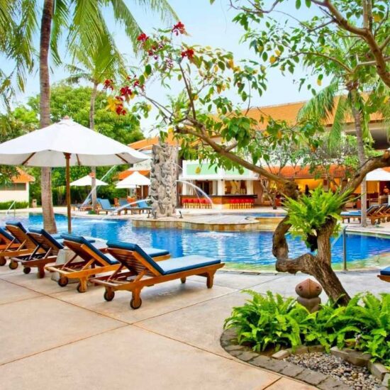 Surrounded by lush tropical gardens, frangipani trees, and swaying coconut palms, the central swimming pool is the heart of the hotel. A cascading waterfall and gentle fountains add to the calming rhythm of the space, creating a tranquil setting for your Bali getaway.
