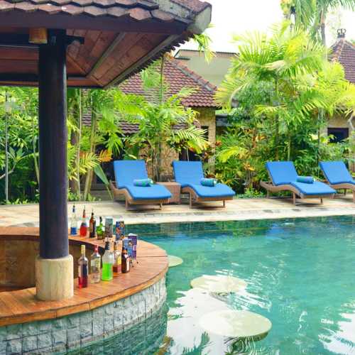 Pertiwi Bisma Ubud is a peaceful escape just a short walk from Ubud Centre, set on Jalan Bisma, it’s surrounded by lush greenery with rice-terrace/valley outlooks. The resort combines modern comfort with Balinese and Hindu-heritage design touches. On-site highlights include an infinity pool and an open-air restaurant – ideal for a relaxed Ubud stay close to the action.