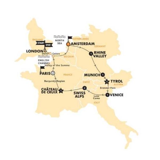 Amsterdam, Rhine Valley, Venice, Swiss Alps and Paris
