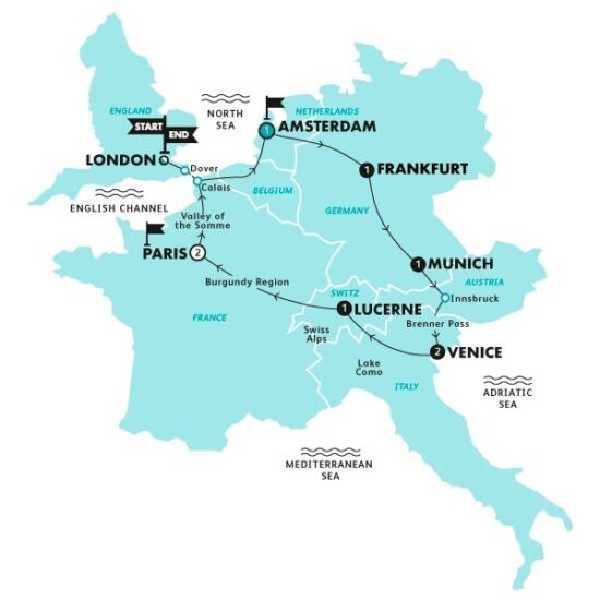 This one gives you a taste of Europe’s highlights for those tight on time. Think 9 countries, 8 days and a handful of the top hotspots – this is how you tick off Europe’s essential travel destinations without hanging around. Glide through the canals of Venice, see the Eiffel Tower & Arc de Triomphe lit up by night, indulge in some sausages and steins at a Bavarian beer hall, explore the glory of the Swiss Alps and visit the cute gable-houses of Amsterdam – all in just over a week. Now that’s magic.