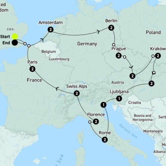 This epic 23 day trail through Europe balances all the sightseeing icons with unexpected marvels and underrated destinations. From walking the cobbled streets of Michelangelo’s Florence and seeing Paris lit up at night, to a sobering WW2 education in Poland and bunking down amid snow-capped mountains in the Swiss Alps, this is a barnstorming European best-of. Because we don’t want you to miss out on the unmissable.