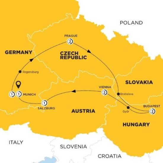 Experience 5 countries in 10 days! Cathedrals, castles, cobbled lanes, and the mighty Danube – this stately 10-day sojourn through the imperial capitals of Europe will see you visit Bohemian Prague, the eclectic Slovakian capital of Bratislava and Mozart’s Vienna and Salzburg. You’ll encounter a multicultural crossroads in Budapest, the medieval treasures of Regensburg and sounds of ‘Do-Re-Mi’ in the Mirabell Gardens.