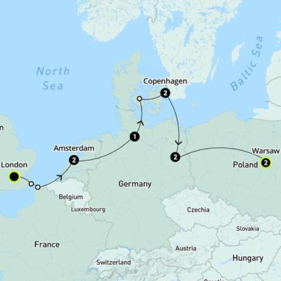 Cross five countries in ten days and discover endless new experiences and countless memories. Cruise Amsterdam’s canals and culture and find out why hipster Copenhagen is known as the happiest city in the world. From edgy Berlin with its lively nightlife to Poland’s vibrant capital, you’ll learn the local secrets, taste authentic local eats and live your best life along the way.