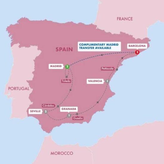 Experience 1 country in 9 days! Savour shared moments with locals enjoying sangria in sun-dappled courtyards, zesty paella and the sounds of the Spanish guitar. On this journey, you’ll explore the wonders of Spain, from the ornate walls of the Alhambra to the Gothic Cathedral and Giralda Tower in Seville.