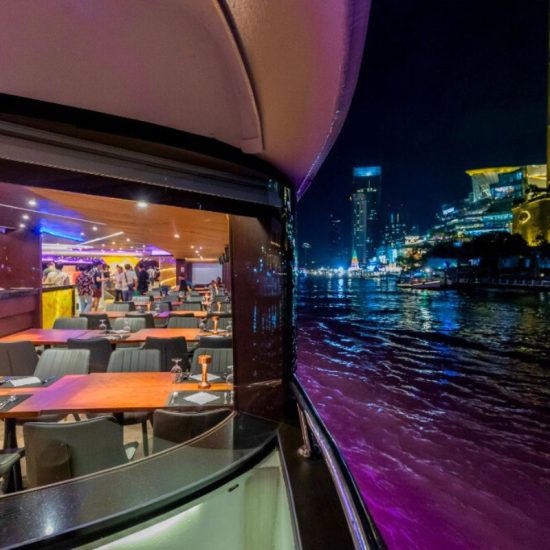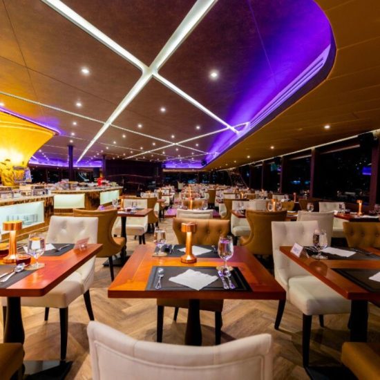 Throughout your journey, you’ll be treated to stunning views of Bangkok’s iconic landmarks, with the majestic Temple of Dawn (Wat Arun), the grandeur of the Grand Palace, the elegance of Rama VIII Bridge, and the lively Asiatique the Riverfront all beautifully illuminated against the night sky. As the river gently carries you through the heart of this dynamic city, you’ll feel the pulse of Bangkok while basking in the luxury and serenity of your surroundings.