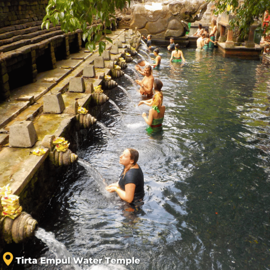 Further along, the sacred waters of Tirta Empul Temple invite you into one of Bali’s most meaningful traditions. Watch as locals and travelers alike take part in holy purification rituals, the spring water glimmering as it flows through ancient stone fountains — a ritual of renewal and gratitude that has endured for centuries.