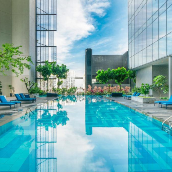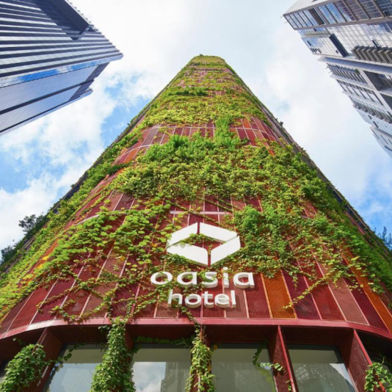 Rising above the city’s concrete and steel, Oasia Hotel Downtown is a true urban standout – wrapped in a striking lush green façade that forms a breathtaking vertical garden. Accented by soaring sky gardens and sleek architectural lines, this tropical skyscraper brings a refreshing burst of nature to the heart of the Central Business District.