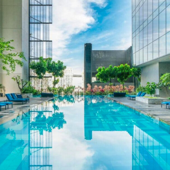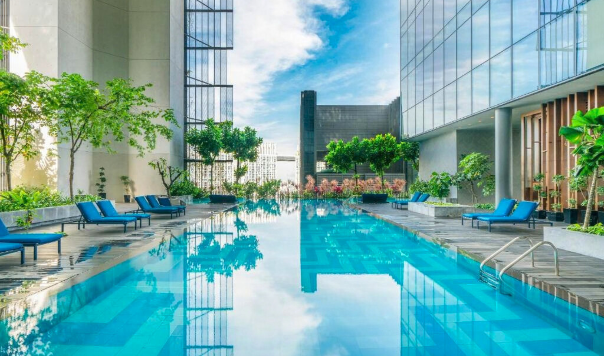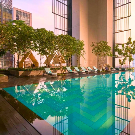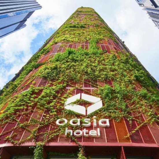 Rising above the city’s concrete and steel, Oasia Hotel Downtown is a true urban standout – wrapped in a striking lush green façade that forms a breathtaking vertical garden. Accented by soaring sky gardens and sleek architectural lines, this tropical skyscraper brings a refreshing burst of nature to the heart of the Central Business District.