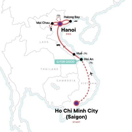 - Hotels (6 nts), sleeper train (1 nt), junk boat (1 nt), homestay (1 nt).